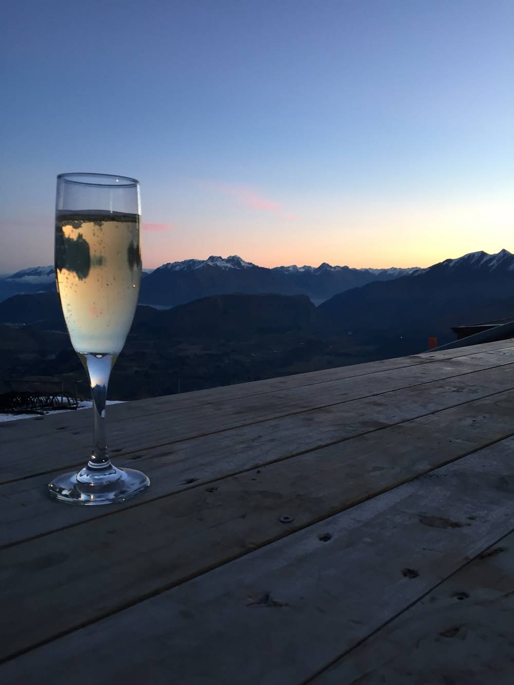 We were picked up in town and met by our host who greeted us and explained how the evening would go. All of us diners were put on our own bus and then driven up to Coronet Peak and straight to Heidi’s Hut. Walking up to Heid’s Hut we were greeted with a warm fire and champagne to enjoy the sunset from outside.