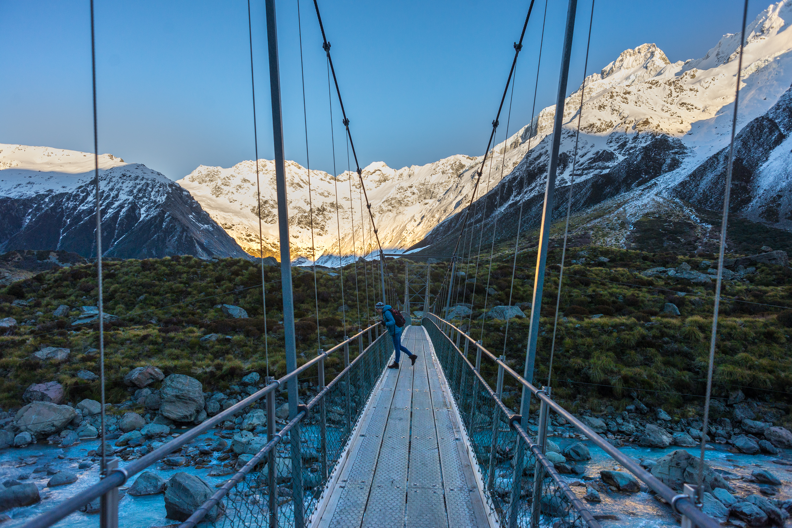 Bailey walking on one of the suspension bridges on the Hooker Valley Track in Mount Cook National Park, New Zealand