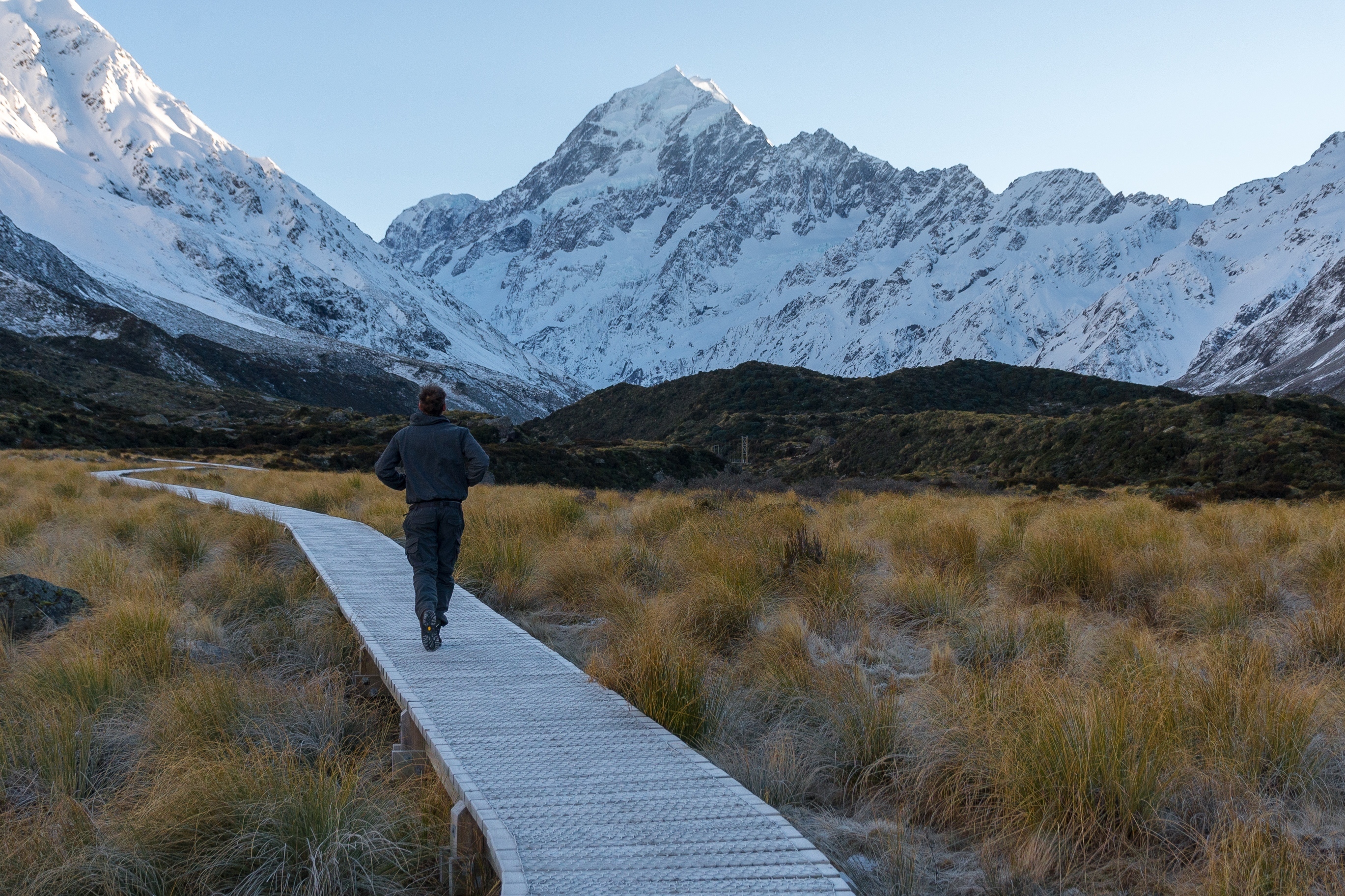 Daniel walking along the boardwalk of the Hooker Valley Track