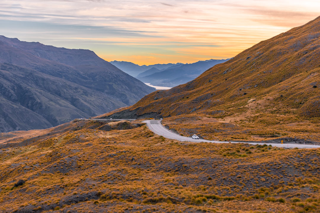 The Crown Range is New Zealand’s highest main highway. It climbs up the mountains around Queenstown and then heads off to Wanaka. Just as you reach the highest point of the Crown Range, there is a pullover bay and it is here that you’ll get the stunning views of Queenstown and the surrounding area.