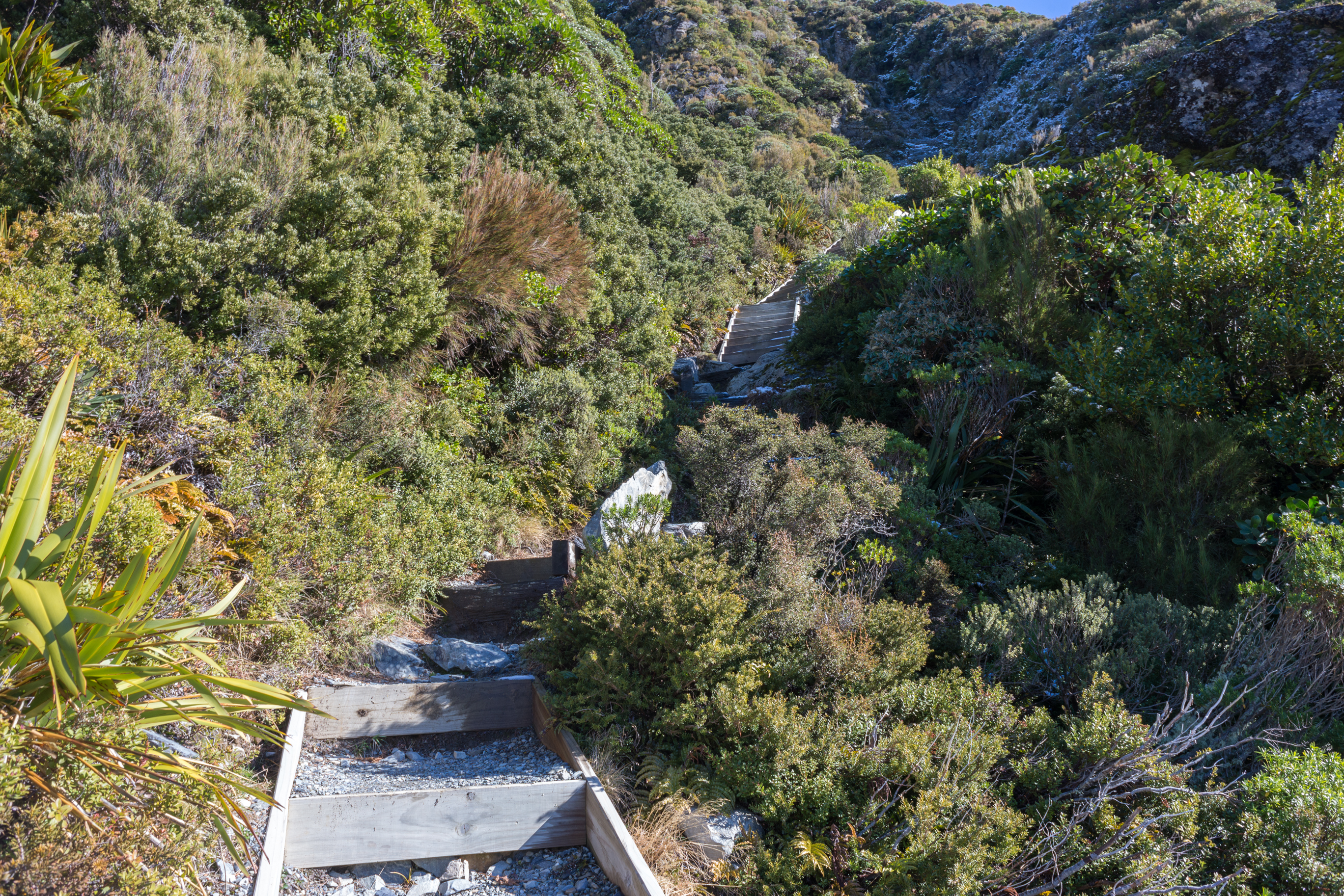 Steps up the Sealy Tarns to the Mueller Hut