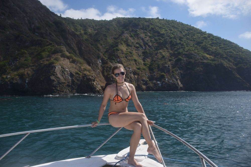 Bailey poses at the front our boat before we went snorkeling near Isla de la Plata