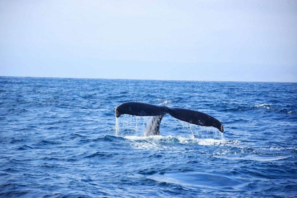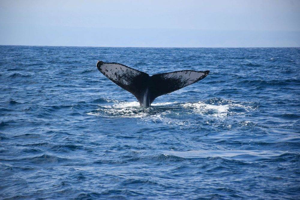 The tale of a humpback whale breaches the waters of the Poor Man’s Galapagos
