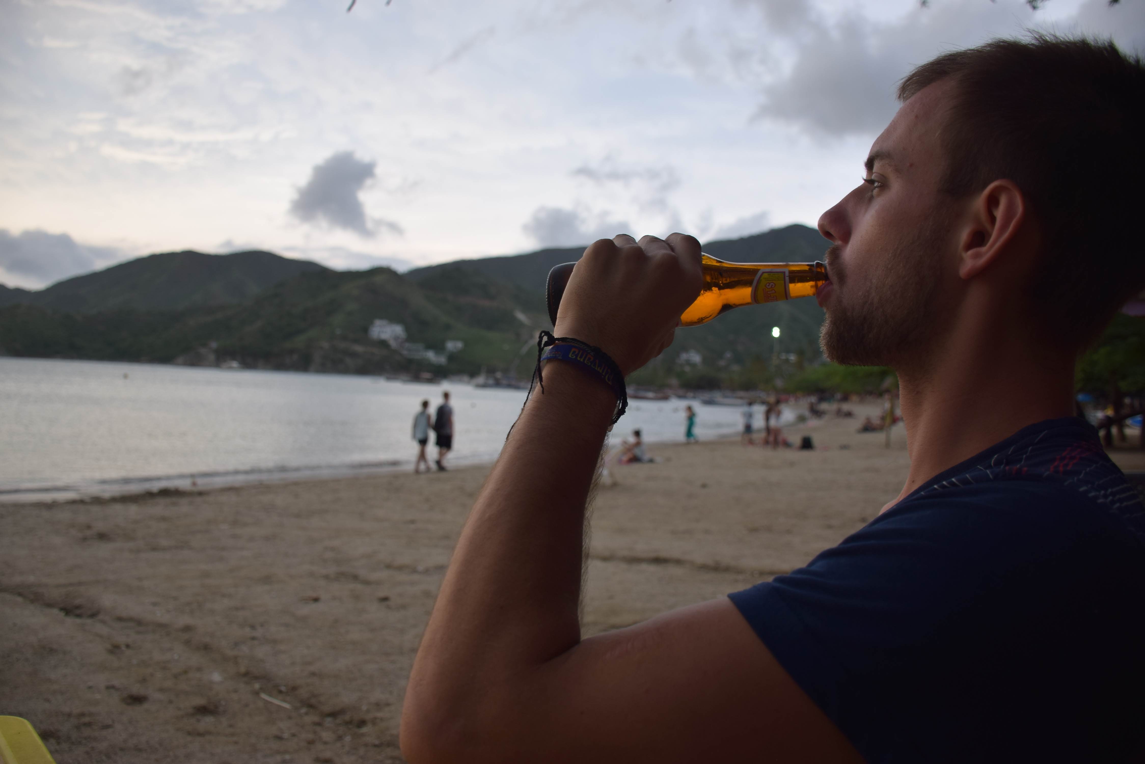 Bailey and Daniel drink cocktails as the sun sets on Taganga Beach near Santa Marta